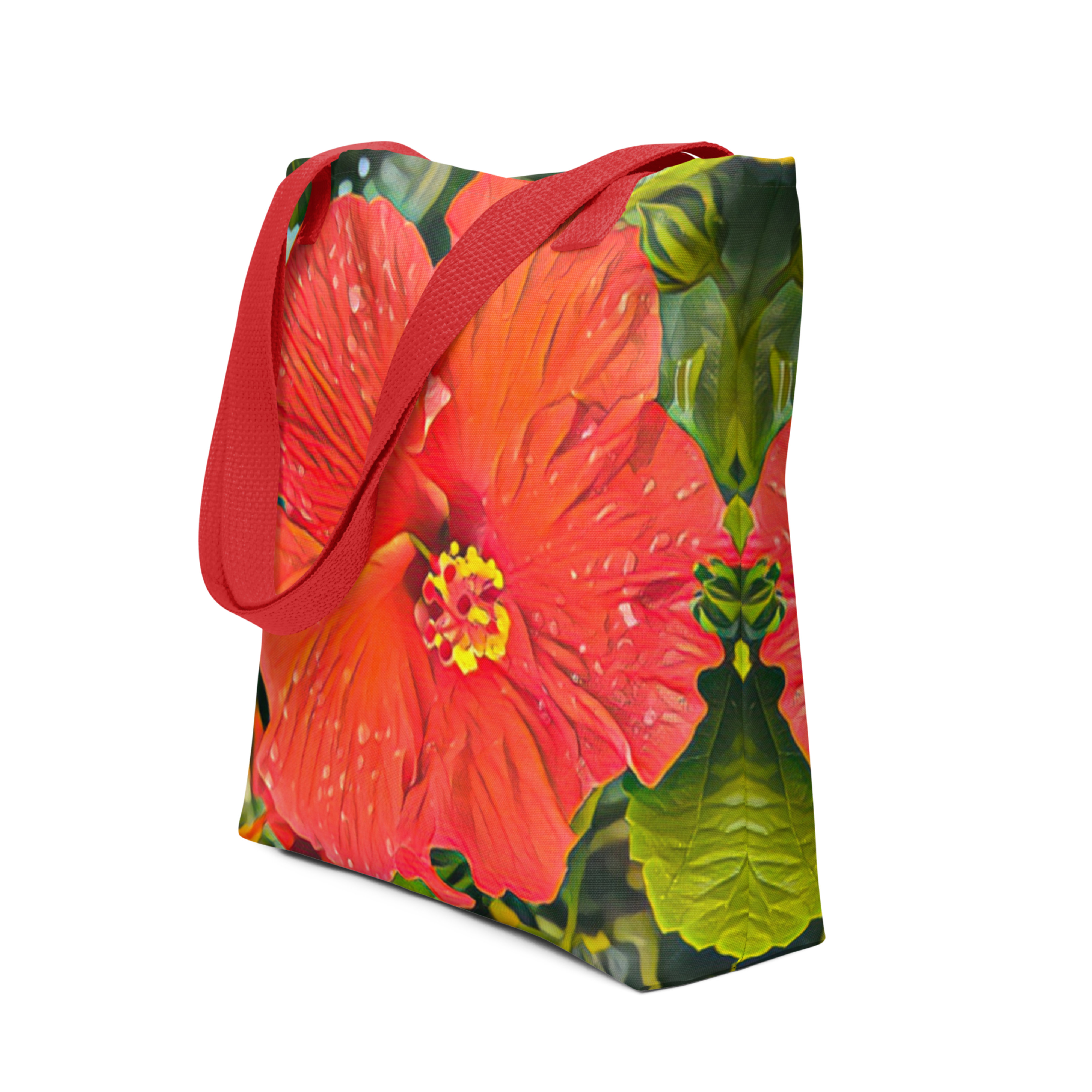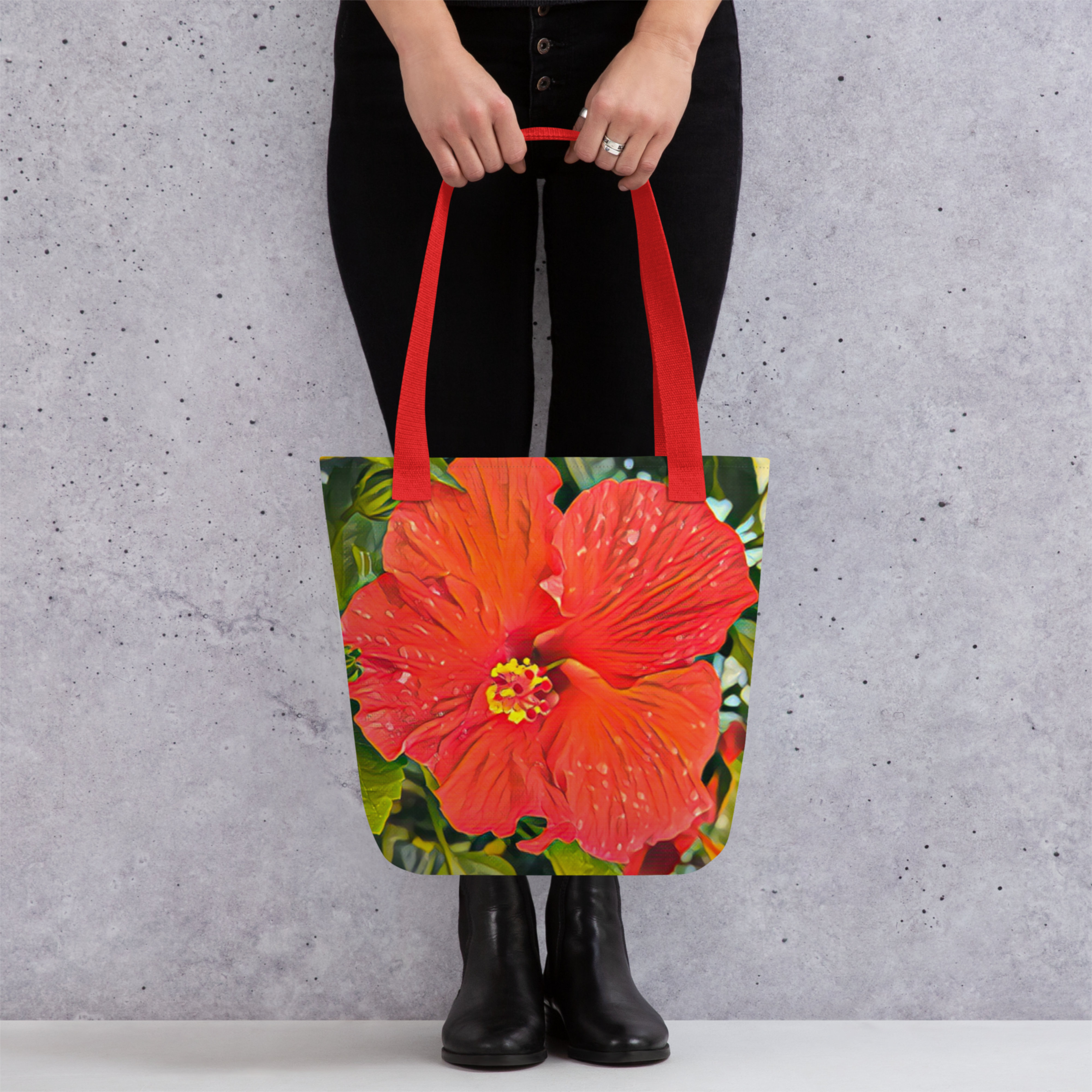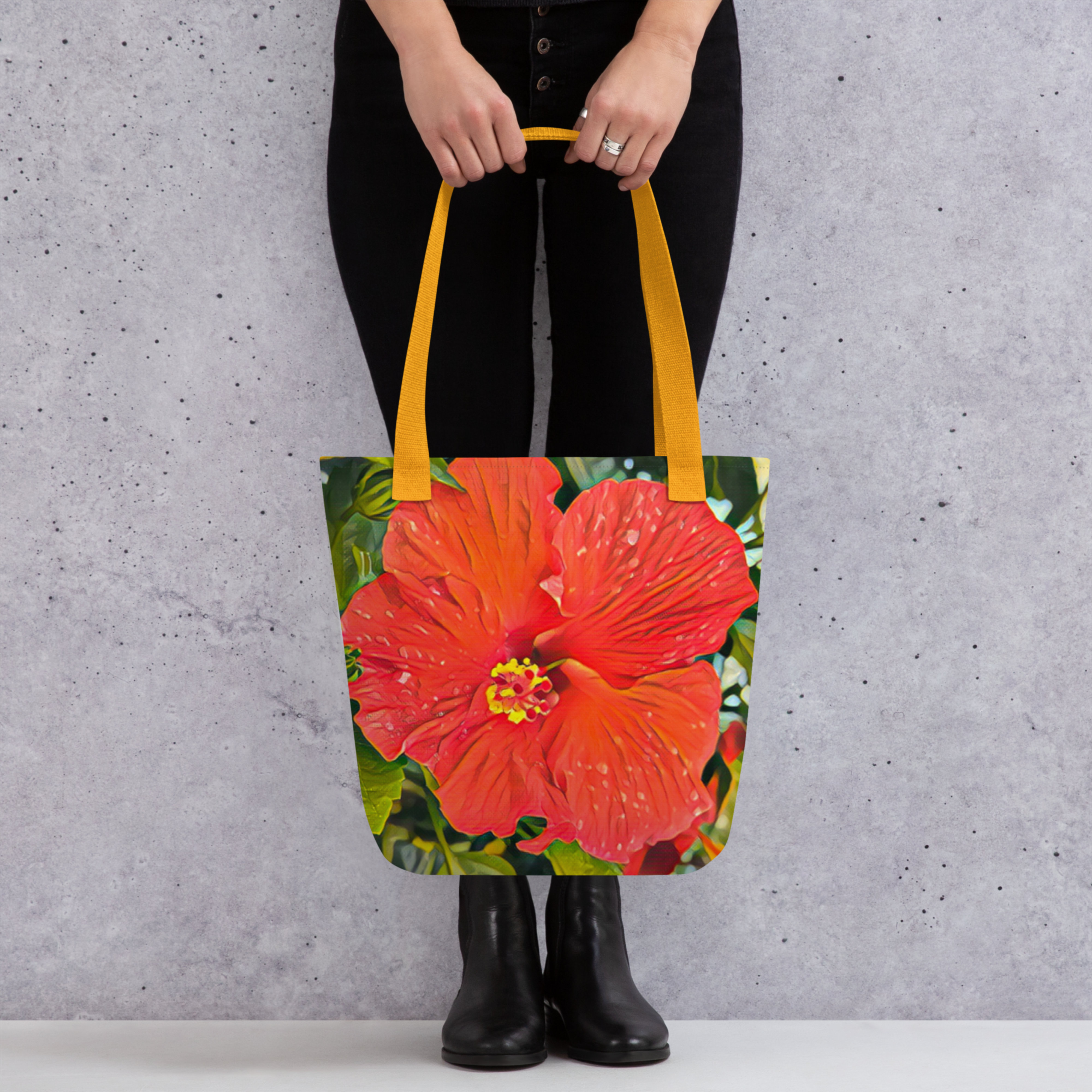 Bold Cayena Blossom Tote Bag Vibrant Hibiscus Floral Art, Tropical-Inspired Statement Bag